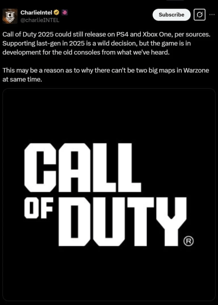“Call of Duty 2025 ainda pode ser lançado no PS4 e Xbox One, segundo fontes”, afirma CharlieIntel, um canal conhecido pela extensa cobertura de Call of Duty, com um histórico de postar informações sobre a franquia antes de ser oficialmente revelada.