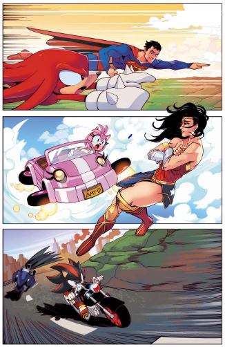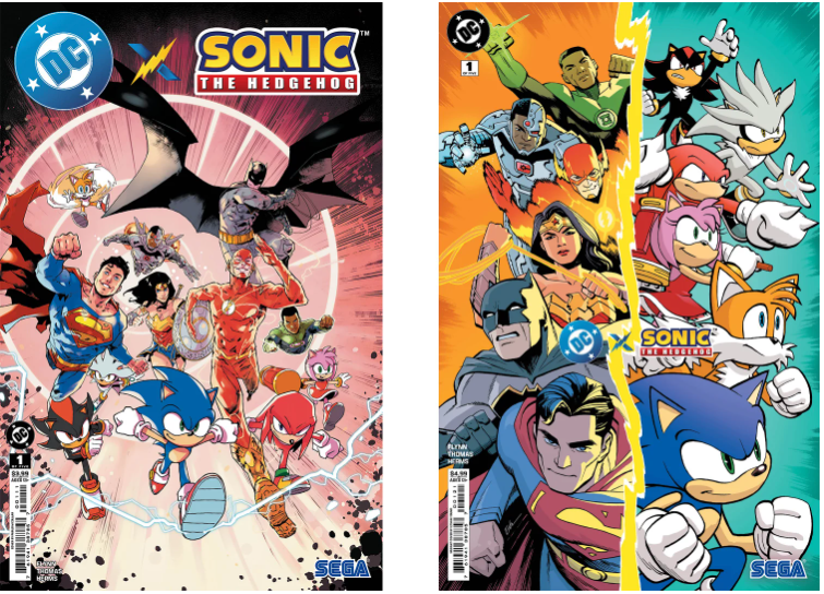 “Em DC x Sonic the Hedgehog, do escritor Ian Flynn e do artista Adam Bryce Thomas, a Liga da Justiça encontrará Sonic e seus amigos para dar início a uma nova série de quadrinhos de cinco edições”, diz a descrição oficial da DC (via AIPT).