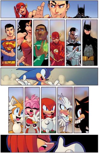 A primeira é uma foto de grupo com Sonic, Flash, Knuckles, Superman, Tails, Mulher-Maravilha, Shadow, Batman, Amy Rose e Cyborg em um post de ação.