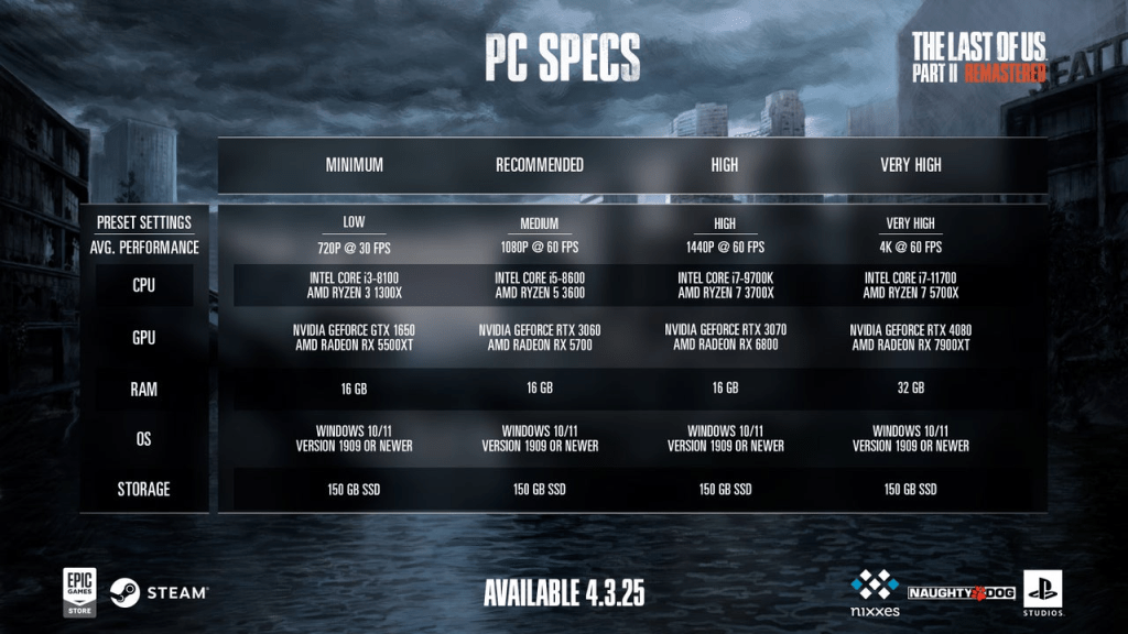 A Sony confirmou as especificações de The Last of Us Part II Remastered para PC antes de sua data de lançamento em 3 de abril, incentivos de login da PSN e anunciou novo conteúdo chegando ao No Return Mode no PC e no PlayStation 5.