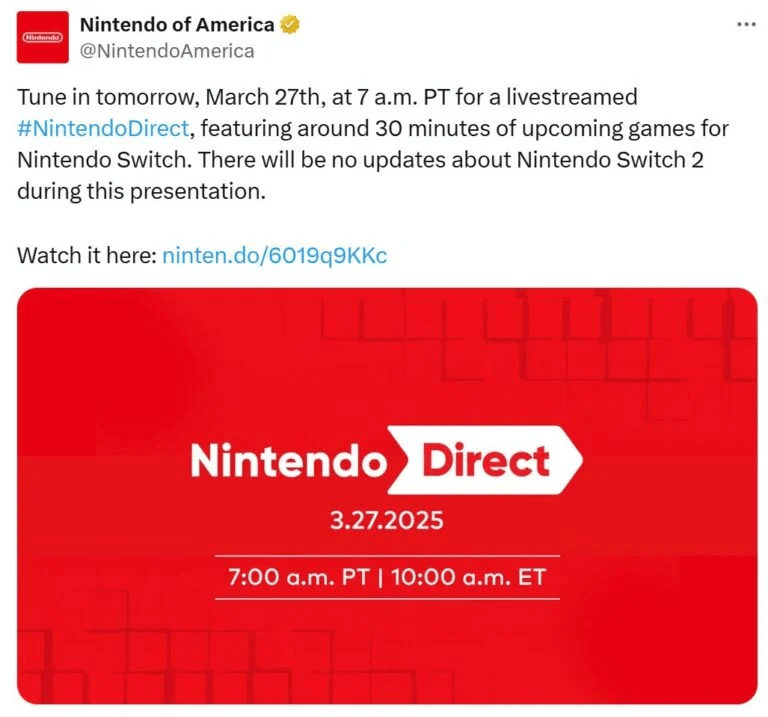 A Nintendo anunciou que realizará outra apresentação Nintendo Direct amanhã.