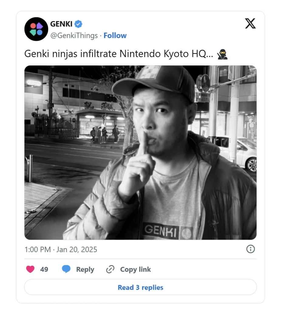A linha do tempo da Nintendo continua com uma publicação no X mostrando o CEO da Genki, Edward Tsai, e a legenda “Ninjas da Genki se infiltram na sede da Nintendo em Kyoto”.