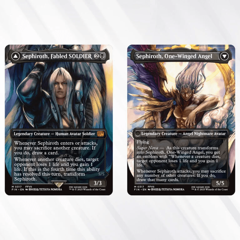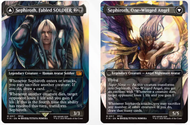 “Desta vez, desenhei Sephiroth tanto na frente quanto no verso da carta”, disse Nomura em um comunicado. “Na verdade, desenhei-as de forma que se juntassem se colocadas uma em cima da outra, então, se você conseguir pegar duas cartas iguais e alinhá-las, verá como ficou a ilustração original.”