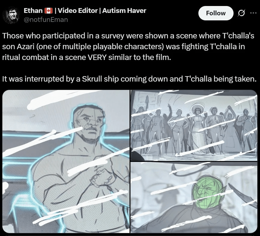O jogo, que estava em desenvolvimento na agora fechada Cliffhanger Games, teria colocado os jogadores no papel do filho de T’Challa, de acordo com um usuário do X citando uma pesquisa realizada pela EA.