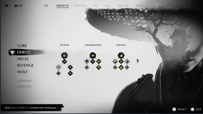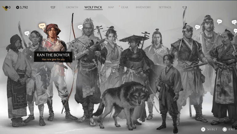 Entre os encontros de combate e os momentos de risco com a morte, os jogadores podem permitir que Atsu descanse sob as estrelas. Aqui, você pode cozinhar, tocar música e até mesmo encontrar aliados enquanto aprecia tudo o que os céus de Ezo têm a oferecer. Com essas mudanças, também vem um substituto para o diário padrão conhecido como Atsu’s Wolf Pack. A Sucker Punch chama o sistema de menu de uma “maneira mais orientada pelo personagem de gerenciar aliados e vendedores” encontrados durante a jornada de Atsu. É uma maneira direta de ver quem pode ter algo a oferecer e vem com uma arte para cada rosto que você encontrar.