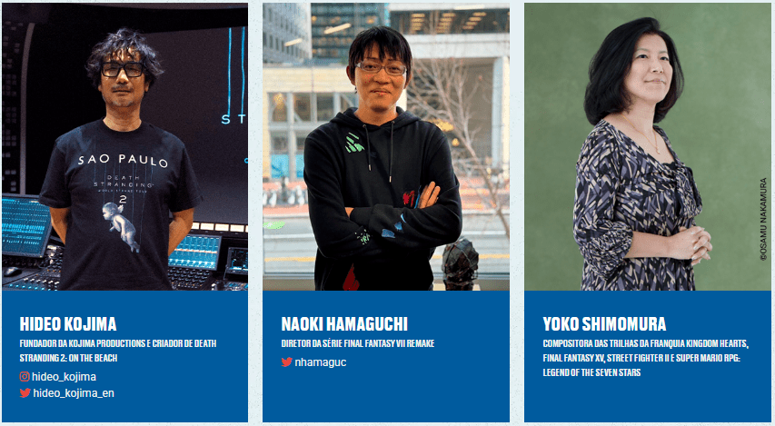 A Brasil Game Show 2025 promete reunir alguns dos nomes mais influentes da indústria dos games. Entre os confirmados estão lendas como Hideo Kojima, criador de Death Stranding, que estará presente para painéis, meet & greet e será jurado no concurso de cosplay; e Yoko Shimomura, compositora de trilhas icônicas como as de Final Fantasy, que receberá o prêmio Lifetime Achievement Award.