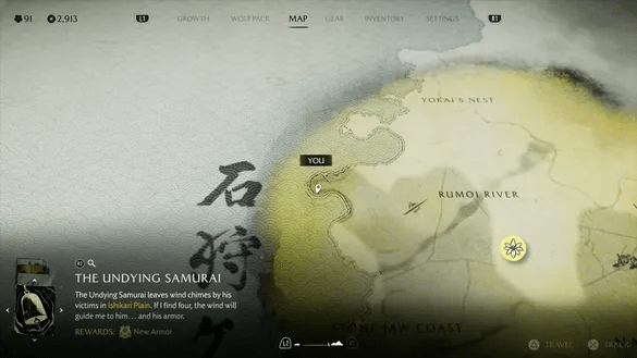 Fale com ele para iniciar a missão do Samurai Imortal, onde você terá a tarefa de coletar 4 sinos e usar o vento para encontrá-los.