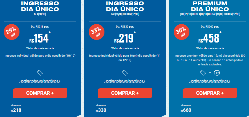 Como estamos a 1 dia do evento, alguns ingressos individuais já estão esgotados, como o de sabado, mas os ingressos de sexta e domimgo, passaporte e camarote continuam disponiveis. Então se você ainda não comprou o seu, ainda da tempo!