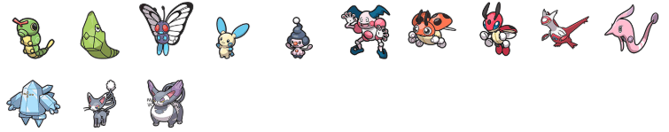 - Yanma–(Evolui subindo de nível sabendo o golpe Poder Antigo)–>Yanmega