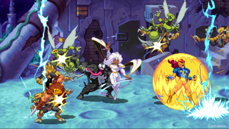 Mas como atrair pessoas que não são fanáticos como eu? Como convencê-las a dar os primeiros passos na Estrada da Perturbação? Absolum , lançado este ano , tentou isso mesclando um jogo de luta de rua mecanicamente excelente com um roguelite mediano. A Tribute Games, desenvolvedora de Marvel Cosmic Invasion, os mesmos caras por trás de Shredder’s Revenge, o melhor jogo das Tartarugas Ninja desde Turtles in Time, adota uma abordagem diferente. Ela se inspira nos antigos jogos de luta Marvel vs. Capcom e faz uma das perguntas mais ousadas que já vi um jogo de luta de rua fazer em um piscar de olhos: e se fosse um jogo de luta em dupla onde você controlasse vários heróis? A resposta, como se vê, é incrível, mesmo que a execução de Cosmic Invasion não faça jus a esse conceito.