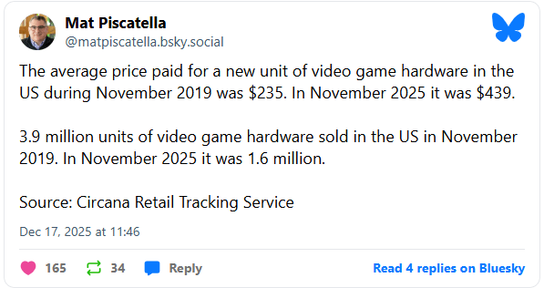 No entanto, este ano o preço médio pago por uma nova unidade de hardware de videogame foi de US$ 439, um recorde histórico (e 11% maior que no ano passado), o que provavelmente foi o principal motivo para as vendas relativamente baixas.