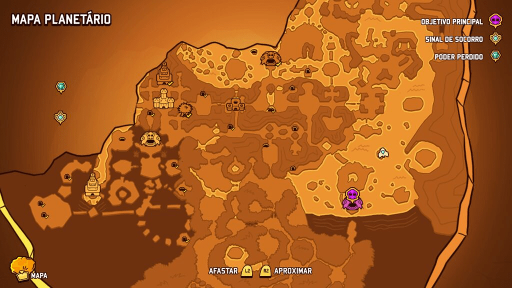 Comecemos pelas minhas dúvidas. Minishoot Adventures é um Metroidvania e, para começar, o mapa do mundo está praticamente vazio. Você pode explorar a área inicial, que por si só contém muitas cavernas e masmorras para se aventurar, mas também pode ir além dos limites do mapa e explorar diversas zonas adjacentes. O resultado foi que, depois de uma hora de jogo, me senti completamente perdido.