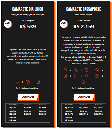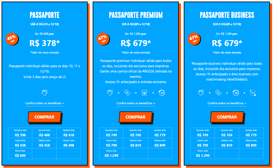 A BGS 2026 oferece diferentes modalidades de ingressos, pensadas para atender a todos os perfis de público. Confira as opções: