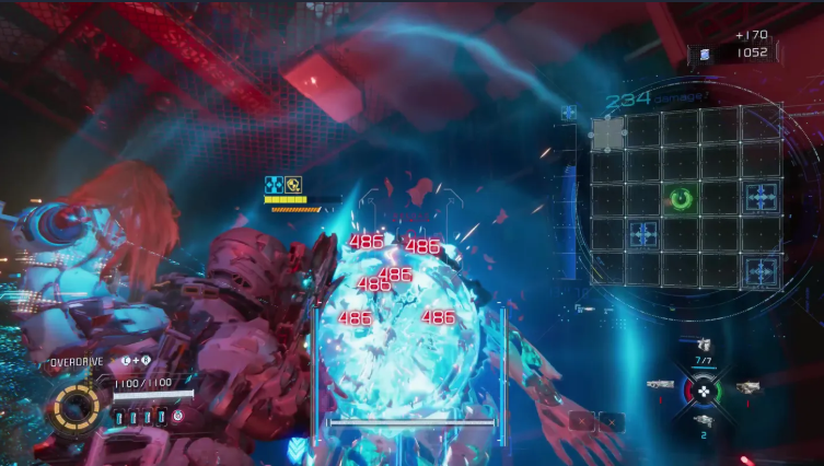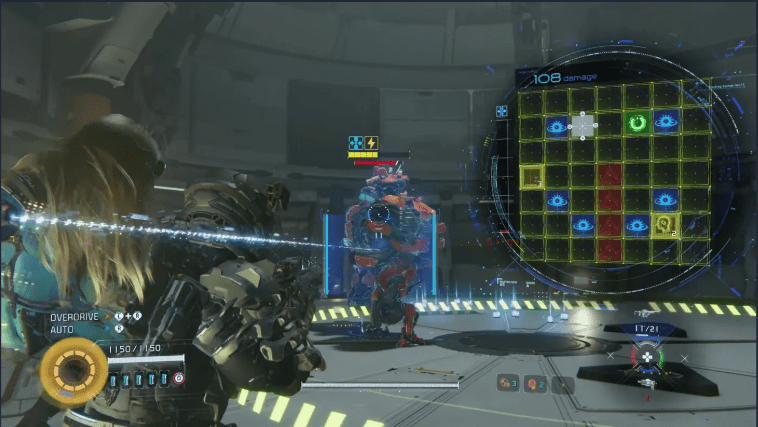 A invasão acontece em tempo real sempre que você mira, exigindo que você resolva um quebra-cabeça de caminho baseado em grade, desenhando uma rota de um ponto a outro usando os botões frontais do controle. Invasões bem-sucedidas expõem os pontos fracos dos inimigos e os tornam suscetíveis a danos reais. Essa é a principal característica da Pragmata, e não há como evitá-la, já que os inimigos são basicamente impenetráveis sem ela. Minhas maiores preocupações nas primeiras horas eram se essa mecânica se tornaria cansativa e se ela poderia evoluir de maneiras interessantes conforme você progride, felizmente, essas preocupações foram rapidamente dissipadas, pois se prova uma das melhores ideias que vi em um jogo de tiro em muito tempo.