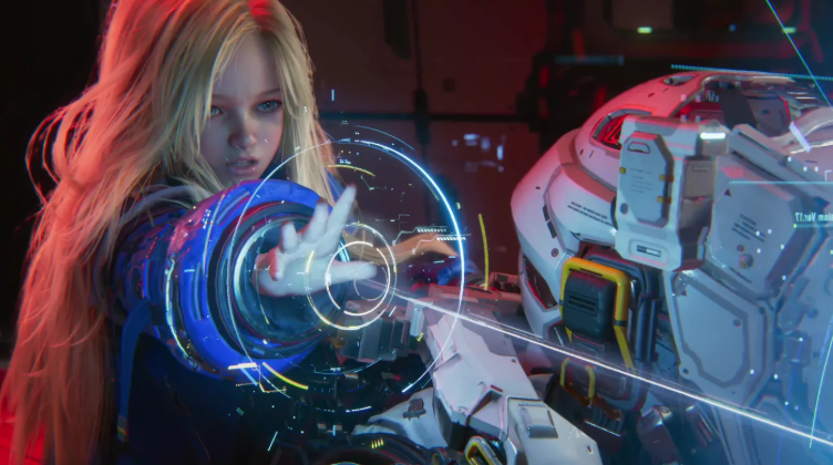 Algo que aprecio em Pragmata é que o jogo não perde tempo para te envolver na história depois que ela começa. Uma breve introdução te dá o suficiente para entender Hugh, o protagonista, antes que uma IA rebelde volte a estação espacial lunar e seu suprimento infinito de robôs contra sua tripulação, deixando-o como o único sobrevivente. Há uma breve conversa sobre como a empresa da tripulação recorre à impressão 3D em uma escala inimaginavelmente gigantesca para fabricar a maior parte do que existe na Lua, e como é mais fácil para ela simplesmente reimprimir a infraestrutura do que mantê-la adequadamente. É uma abertura eficaz que estabelece uma premissa coerente para o restante da campanha de aproximadamente 12 horas, embora a história em si não explore isso com muita profundidade. Ela se concentra mais na verdade sobre uma garota robô humanoide chamada Diana, que rapidamente se torna a parceira de Hugh no crime, ela cuida da invasão cibernética enquanto ele cuida dos tiros, e é aqui que Pragmata brilha.